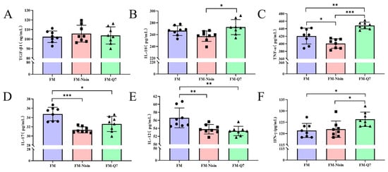 Effects of FM-Nisin and FM-Q7 on the expression of inflammatory factors. (A) TGF-β1; (B) IL-10; (C) TNF-α; (D) IL-17; (E) IL-12; (F) IFN-γ. Data are presented as means ± SDs (n = 8). * p < 0.05, ** p < 0.01 and *** p < 0.001.