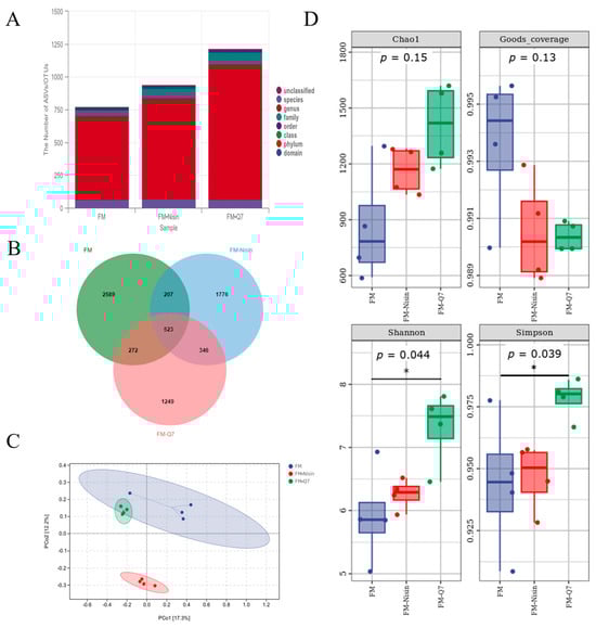 Effects of FM-Nisin and FM-Q7 on gut microbiota composition in mice. (A) Species classification annotations. (B) Venn diagrams of ASVs/OTUs. (C) β-diversity assessed via PCoA. (D) α-diversity calculated through QIIME2. * p < 0.05.