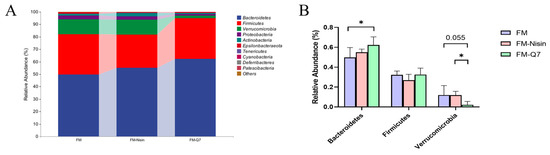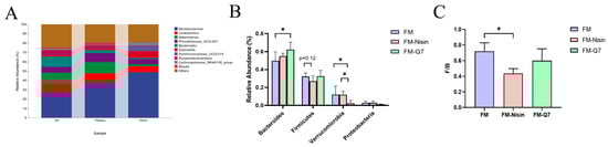 The analysis of genus-level species revealed Bacteroides occurrence was increased in the FM-Q7 group compared to the FM group. The abundance of Firmicutes in the FM-Nisin group and the abundance of Verrucomicrobia in the FM-Q7 group were remarkably less than that in the other two groups (Figure 6). Compared to the FM group, the F/B value of the FM Nissin group significantly decreased by 39.52% while the F/B value of the FM-Q7 group decreased by 16.59% (Figure 6C).