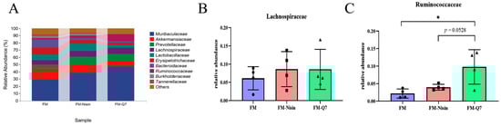 The relative abundance of different bacteria at the family level. (A) Microbial community bar plot by family; (B) Lachnospiraceae; (C) Ruminococcaceae. * p < 0.05.
