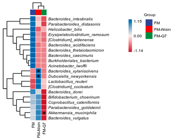 The effects of FM-Nisin and FM-Q7 on the richness of the host gut microbiota were investigated at the species level. In the FM-Q7 group, there was a significant decrease in Akkermansia_muciniphila occurrence while a notable increase in Bacteroides_xylanisolvens and Dubosiella_newyorkensis occurrence was observed (Figure 7). Akkermansia_muciniphila was found to comprise normal bacteria in the human gut and was representative of Verrucomicrobia [22], and often negatively correlated with the host inflammation level. This was consistent with the reduction in Verrucomicrobia occurrence and the low inflammation in the mice. The alterations in gut microbiota may comprise a potential factor in the regulation of the inflammatory stress level in the body. Interestingly, Bacteroides_xylanisolvens has emerged in recent years as an amazing treatment for NAFLD [23], and it was remarkably increased in FM-Nisin. This phenomenon indicated that the intake of FM-Nisin might lead to a change in the balance of gut microbiota.