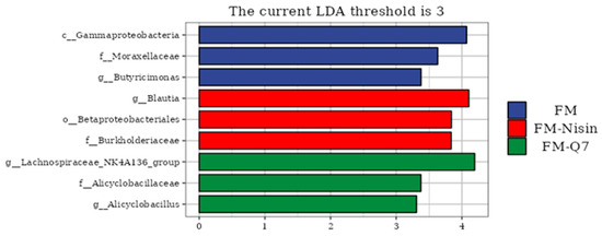 The LEfSe analysis results showed that compared with the group without FM, the marker species present in the host gut microbiota were significantly different after consuming FM-Nisin and FM-Q7. There was a minimal disparity in the enrichment of marker species between the FM-Nisin and FM-Q7 groups in comparison to the FM group (Figure 8). The g_Lachnospiraceae_NK+4Al36_group could improve the function of the intestinal barrier and produce butyrate, which was significantly negatively correlated with inflammation levels [24].