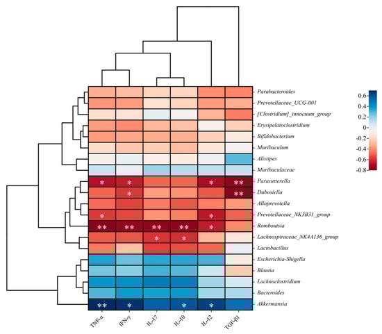 Correlation analysis between gut microbiota (genus level) and immuno-inflammatory factors. * p < 0.05, ** p < 0.01.