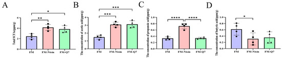 Effects of FM-Nisin and FM-Q7 on the content of SCFAs. Total short-chain fatty acids (A), acetic acid (B), propionic acid (C), and butyric acid (D). * p < 0.05, ** p < 0.01, *** p < 0.001, **** p < 0.0001.