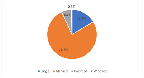 The survey results showed that the majority of respondents, i.e., 76.7%, were married (see Figure 2). A total of 83.6% of respondents had higher education and 46.6% of soldiers declared that they lived in the countryside and in small towns (<50,000 inhabitants). The remaining respondents lived in large cities with over 50,000 inhabitants. When asked who they lived with on a daily basis, only 11.4% of all respondents answered that they currently live alone.