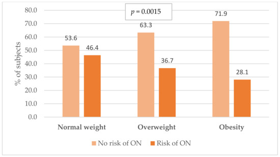Incidence of orthorexia risk in military flying personnel in relation to body mass index (BMI). ON—orthorexia nervosa; p-value for the chi2 test.