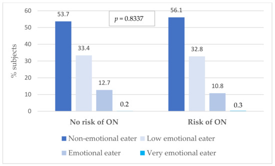 Comparison of the incidence of emotional eating in a group of subjects with a risk of ON and those with no risk of ON. ON—orthorexia nervosa; p-value for the chi2 test.