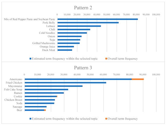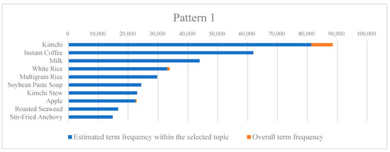 Table 3 delineates the most frequently occurring food items within each identified pattern, and Figure 1 depicts the estimated term frequencies for the top ten food characteristics of each pattern. The first pattern, which can be described as “Traditional and Staple”, is replete with items such as “Kimchi”, “Instant Coffee”, “Milk”, “White Rice”, and “Multigrain Rice”. This pattern is emblematic of a diet steeped in Korean culinary heritage, with a staggering 67.1% of participants and 62.3% of the textual mentions aligning with this group. The prevalence of this pattern underscores the quintessential role these foods play in daily consumption and reflects the cultural gastronomic identity. The dietary preferences exhibited here also shed light on the potential health benefits and drawbacks associated with a diet rich in rice-based dishes and fermented products.