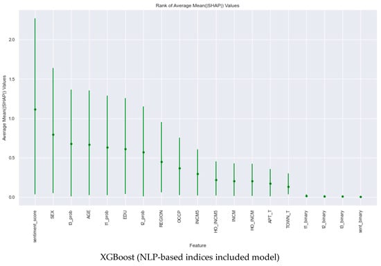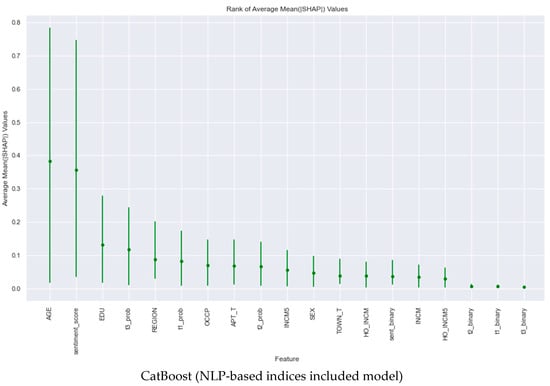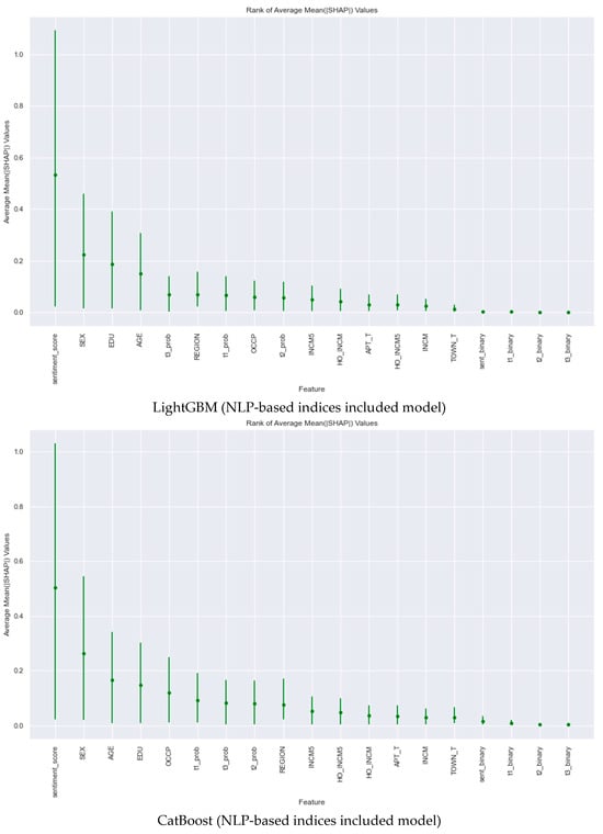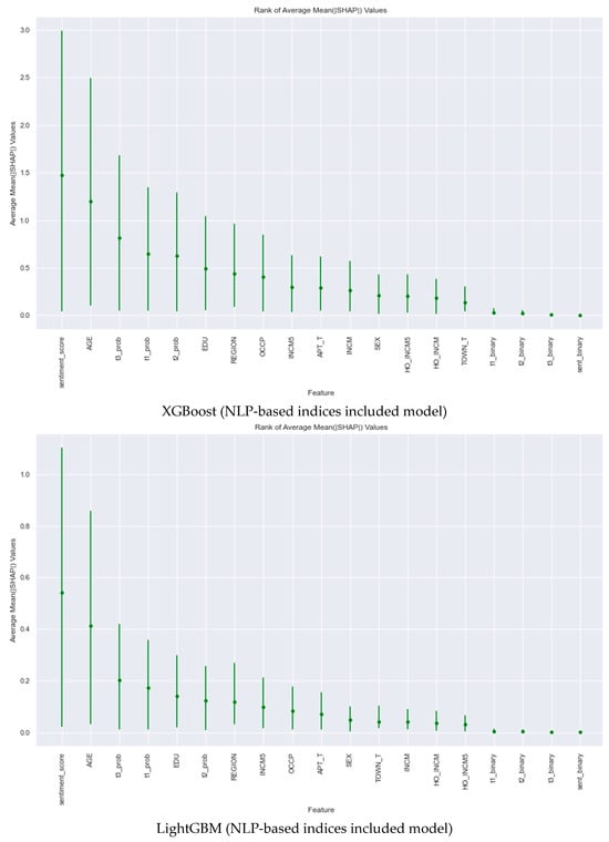Table 5 presents the comparative results for dyslipidemia prediction using the XGBoost, LightGBM, and CatBoost algorithms, considering both the benchmark models and those incorporating NLP-based indices. Notably, the introduction of NLP-based indices—such as sentiment scores and pattern-based binary variables—yielded improvements in the balanced accuracy and F1 score across the models. For instance, the XGBoost model exhibited an increase in balanced accuracy from 0.5497 to 0.5956 and an increase in the F1 score from 0.5461 to 0.5937.