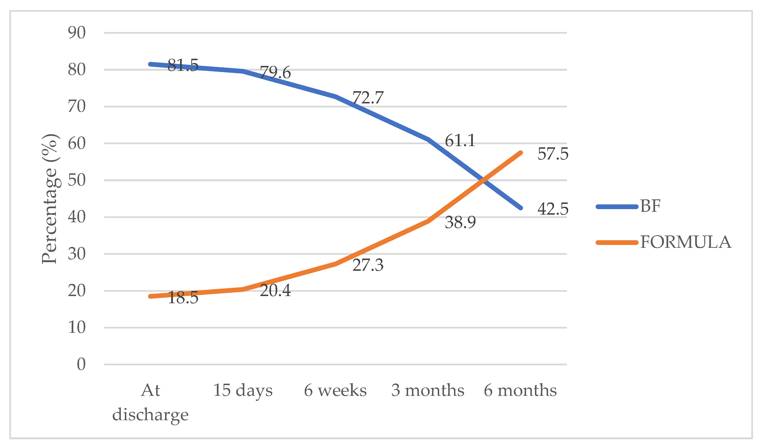 - Response variable: type of nursing (BF/supplementary feeding (SF)/mixed feeding (MF)) at 6 months postpartum, assessing the newborn and infant feeding practices. The response variable “Suspension of BF at 6 months” (yes/no) considered whether the infant was receiving SF (“yes”) or continued with BF or MF (“no”) at 6 months.
