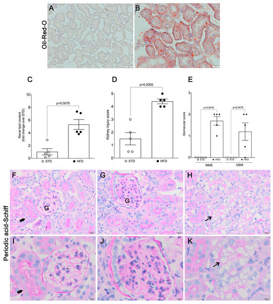 - Deji, N.; Kume, S.; Araki, S.-I.; Soumura, M.; Sugimoto, T.; Isshiki, K.; Chin-Kanasaki, M.; Sakaguchi, M.; Koya, D.; Haneda, M.; et al. Structural and functional changes in the kidneys of high-fat diet-induced obese mice. Am. J. Physiol. Physiol. 2009, 296, F118–F126. [Google Scholar] [CrossRef]