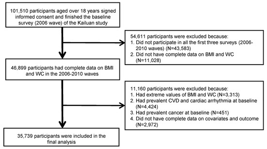 The trajectories were fitted by utilizing repeated data on BMI and WC from the initial three surveys (waves of 2006, 2008, and 2010). As a result, the baseline for our analysis was set as the 2010 wave. Throughout the 2006–2010 waves, BMI and WC measurements were completed by a total of 46,899 participants. We excluded participants with extreme values of BMI and WC (exceeded the 99 percentile of the overall study population, N = 3313); with prevalent CVD, CA (N = 4424), and cancer (N = 451) in and before baseline; and those who did not have complete data on covariates and outcomes (N = 2972). We ascertained CVD and cancer through the linked hospital admissions database of the Kailuan Medical Group and self-reported physician-diagnosed records [24]. The final analysis comprised 35,739 eligible participants, as shown in Figure 1.
