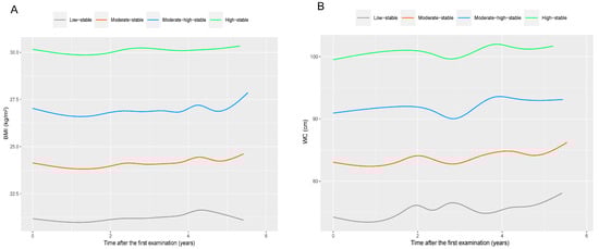 The group-based trajectory model (GBTM) was utilized to fit the trajectories of BMI and WC. This model is a finite hybrid model that identifies sub-populations with similar characteristics [25]. The selection of the best-fitted trajectory model and the number of trajectory groups was based on the Bayesian information criterion (BIC) and the average posterior probability. We identified four trajectories for BMI and WC, respectively, and designated them as the low-stable group, moderate-stable group, moderate-high-stable group, and high-stable group, as illustrated in Figure 2.