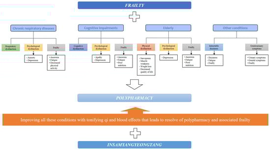 The prevalence of polypharmacy in the elderly is because as they live longer, they are more likely to experience the coexistence of multiple health problems []. Therefore, to reduce polypharmacy, a treatment that has a multifaceted effect on multiple diseases and their comorbidities is needed. IYT has been shown to improve respiratory symptoms in chronic respiratory disease, disease-related frailty, and psychological conditions such as anxiety and depression, resulting in an improved quality of life. In cognitive impairment, IYT has multidimensional effects such as improvement in cognition, anorexia, apathy, fatigue, depression, and nutritional status. Regarding frailty associated with aging, the IYT group showed improvements in muscle strength and body weight, and improved anorexia, fatigue, nutritional status, overall physical function, and psychological status. In addition, there was an improvement in the symptoms and frailty in patients with intractable dizziness and genitourinary symptoms. Taken together, these effects of IYT suggest that IYT may contribute to polypharmacy reduction by replacing some of the effects of conventional medications or may be a preventive method for medication escalation owing to its multifaceted effects on these chronic conditions. For example, in elderly patients with Alzheimer’s disease taking donepezil, choline alfoscerate, appetite stimulants, antidepressants, nutraceuticals, and anticholinergics for cognitive decline, anorexia, depression, fatigue, and overactive bladder symptoms, IYT may replace or reduce the effects of these medications in whole or in part. This process may ultimately lead to the elimination of polypharmacy, thus reducing the risk of polypharmacy. IYT may also improve frailty caused by the polypharmacy itself (Figure 1).