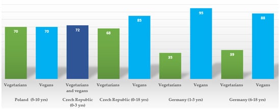 Across different studies, the rates of vit B12 supplementation were as follows: 39% and 88% in German vegetarians and vegans, respectively, aged 6–18 years old []; 35% and 95%, respectively, among German vegetarian and vegan toddlers aged 1–3 years old []; 70% in both vegetarian and vegan children aged 5–10 years old in Poland []; 68% and 85% of vegetarian and vegan Czech children, respectively, aged 0–18 years old; and 72% in a subgroup of both vegetarian and vegan Czech infants, respectively []. Based on these data, substantial proportions of children of vegan and vegetarian children across European populations do not receive vitamin B12 supplements, which can result in serious hematological, metabolic, and neurological complications [,,]. The available evidence regarding the rates of supplementation of vitamin B12 in vegetarian and vegan children is summarized in Figure 2.