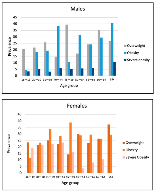Baseline characteristics of participants are described in Table 1. A total of 843 (65.0%) women were included in this study, and the majority of participants were under 50 years old (79.9% of men and 82.7% of women), with a large proportion under 19 years old (30.0% of men and 26.6% of women). Mean BMI was 26.3 ± 5.7 kg/m2 in men and 28.0 ± 6.4 kg/m2 in women (p < 0.05). Obesity was noted in 116 men (25.6%) and 361 women (42.8%), among which 22 men (4.9%) and 144 women (17.1%) presented with severe obesity. Severe obesity was more prevalent among young Nunavimmiut women (between 16 to 44 years old) (Figure 1). Inuit women presented a higher prevalence of abdominal obesity (as defined by WHO cut-offs) compared to men (78.8 vs. 46.4%, p < 0.05). Furthermore, Nunavimmiut women also had higher levels of VFL (estimated using electrical bio-impedance) compared to men (54.4 vs. 20.1%, p < 0.05).
