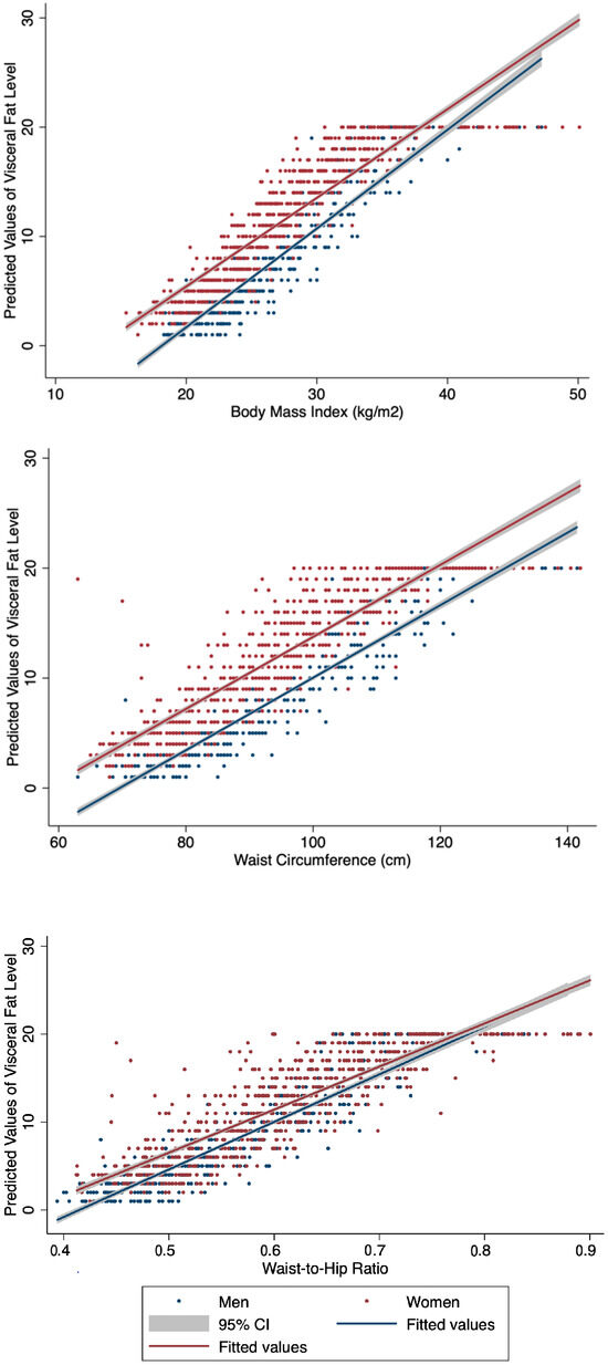 Correlations between anthropometric parameters (BMI, WC, WHtR and VFL) were estimated using standardized linear regression analysis (adjusted for age and BMI in the case of WC and WHtR). Correlation factors with VFL were r = 0.90 for BMI, r = 0.87 for WC and r = 0.89 for WHtR (p-value <0.05 for all). Estimated predicted values of VFL using anthropometric measurement of adiposity are displayed in Figure 2. Anthropometric indices were all significantly correlated with VFL, with BMI being more strongly associated with VFL (standardized β-coefficient of 5.19, 95% CI: 5.04–5.29), compared to WC (standardized β-coefficient of 1.11, 95% CI: 0.84–1.39) and WHtR (standardized β-coefficient of 0.60, 95% CI: 0.31–0.90). For similar values of BMI and WC, women consistently presented a greater adjusted predicted VFL value compared to men. This trend was also noted for WHtR; the estimated VFL value was higher in women, but only up to a certain WHtR level (WHtR = 1.3).