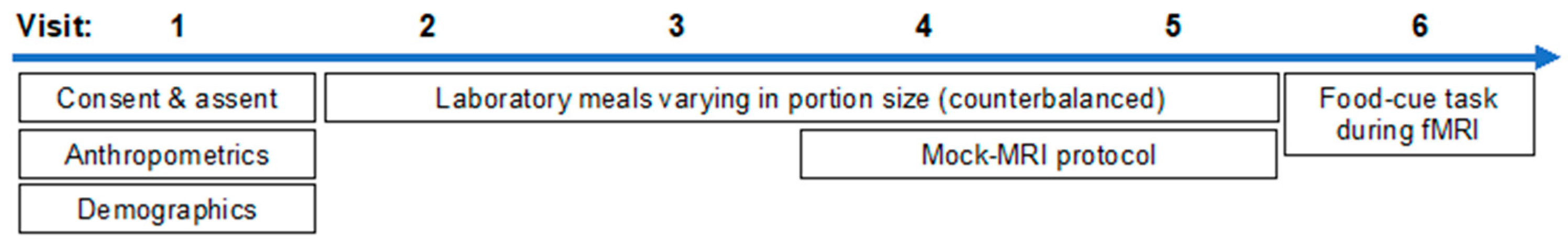 - Keller, K.L.; English, L.K.; Fearnbach, S.N.; Lasschuijt, M.; Anderson, K.; Bermudez, M.; Fisher, J.O.; Rolls, B.J.; Wilson, S.J. Brain Response to Food Cues Varying in Portion Size Is Associated with Individual Differences in the Portion Size Effect in Children. Appetite 2018, 125, 139–151. [Google Scholar] [CrossRef]