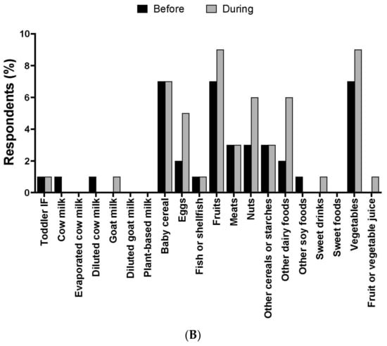 While the use of cow milk, goat milk and alternative milk beverages was low (<1%) and did not change, other complementary foods such as baby cereal were used by 7% of parents before and during the shortage, and the use of other dairy such as yogurt increased from 2% before to 6% during the shortage. These data align with a cross-sectional analysis by Marino and co-workers showing 10% of infant formula users added cereal to formula and 7% fed their infants with solid foods instead of feeding infant formula [].