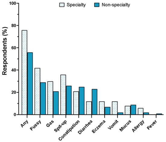 Sixty-one percent of parents who switched formulas reported that their infants had one or more problems in response to switching. A sub-analysis revealed that infants requiring specialty formulas experienced more problems than infants who did not require specialty formulas. Compared with non-specialty formula users, more parents whose infants required specialty formulas reported their infants experienced “any” problems (unadjusted p = 0.045) and specifically vomiting (unadjusted p = 0.026) in response to switching formulas (Figure 4).