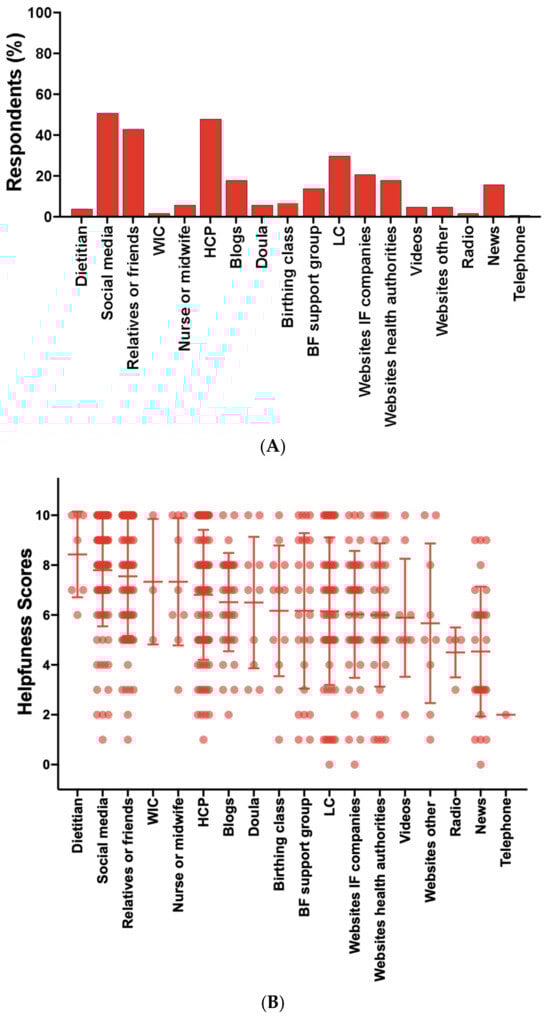 Resources parents used to obtain guidance or support to help them feed their infants during the infant formula shortage. (A). Percent of parents that used each resource. (B). Parents’ ratings on the helpfulness of each resource. Dietitian (n = 7); social media (n = 89); relatives or friends (n = 76); WIC (n = 3); nurse or midwife (n = 9); HCP (n = 84); blogs (n = 33); doula (n = 10); birthing class (n = 12); BF support group (n = 24); LC (n = 53); IF companies’ websites (n = 37); health authorities’ websites (n = 32); other websites (n = 9); videos (n = 9); other (n = 4); news (n = 28); radio (n = 4); telephone (n = 1). HCP = healthcare provider; BF = breastfeeding; LC = lactation consultant or lactation counselor; IF = infant formula. Data are expressed as the mean ± standard deviation error bars.