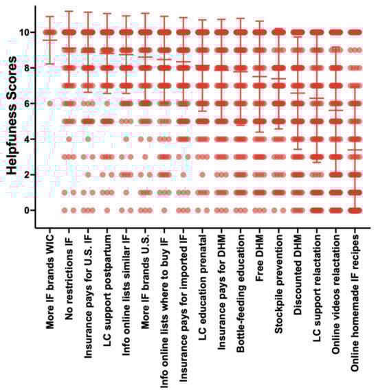 Parents’ ratings on the helpfulness of activities that would help families feed their infants in the near future. More IF brands in WIC (n = 9); no restrictions on IF (n = 166); insurance pays for U.S. IF (n = 169); LC support postpartum (n = 169); info online of lists of similar IF (n = 171); more IF brands sold in U.S. (n =166); info online of lists of where to buy IF (n = 171); insurance pays for imported IF (n =167); prenatal LC education (n = 168); insurance pays for DHM (n = 152); bottle-feeding education (n = 169); free DHM (n = 148); stockpile prevention (n = 163); discounted DHM (n = 140); LC support with relactation (n = 157); online videos of relactation (n = 158); online homemade IF recipes (n = 154). IF = infant formula; LC = lactation consultant or lactation counselor; DHM = donor human milk. Data are expressed as the mean ± standard deviation error bars.