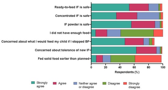Regarding parents’ perceptions about the safety and quality of infant formula, the following percentages of parents agreed or strongly agreed with these statements: ready-to-feed infant formula is safe for infants (80%), concentrated liquid infant formula is safe for infants (64%) and infant formula powder is safe for infants (89%). When asked how they related to some situations associated with the infant formula shortage, the following percentages of parents agreed or strongly agreed with these statements: they did not have enough food to feed their infants (22%), concerned about what they would feed their infants if they stopped breastfeeding (83%), concerned about how their infants would tolerate a new infant formula that was available (91%), introduced solid food to their infants earlier than initially planned (16%) (Figure 7).
