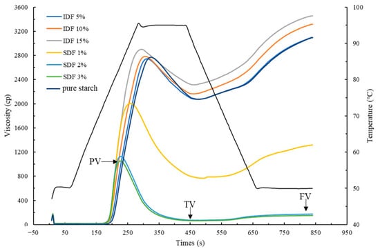 During the pasting process, the PV and FV values increased after the addition of the IDF, probably due to the strong water-absorbing property and certain viscosity of IDF [], which would compete with starch to absorb water in the continuous phase during heating, resulting in increased viscosity in the blended system [,]. The measurements of G″ in the rheological properties also suggested that adding the IDF dramatically affected the viscosity of the starch gels. The BV of the mixture with a 5% IDF addition slightly increased compared to pure starch, and the BV values of the mixtures with 10% and 15% IDF additions both showed a significant decrease compared to pure starch. This might be because the starch had less water to access and utilize after the addition of 10% and 15% IDF, resulting in a low degree of pasting and reduced solubility and therefore a lower BV value and increased starch stability. It was also possible that the IDF cross-linked with leached amylose and surrounded the starch granules, decreasing the starch granule pasting degree and also further suppressing amylose leaching. The lower BV led to a better resistance of the system to thermal and mechanical treatments []. In addition, the increased SV proved that the IDF exacerbated starch retrogradation and somewhat promoted the rearrangement of the pasted and disordered starch granules. This result might be associated with the IDF-bound water, which decreased starch chain mobility [].