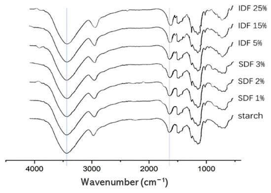Figure 2 displays the FT-IR profiles for the starch/DF mixes and gelatinized wheat starch. The absence of new absorption peaks in the starch with the addition of the IDF and SDF, compared to pure wheat starch, suggested that the dietary fibers and wheat starch did not form covalent bonds.