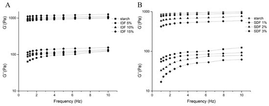 The G′ values of all the specimens were higher than the G″ values, indicating that all specimens were predominantly elastic and closer to the solid state than to the liquid state. The G′ values of the starch/IDF gels were all higher than that of the pure starch gels, but G′ decreased with the increase in IDF addition. This might be due to the fact that the IDF could absorb the bound water, and the water used by the starch for pasting in the system was reduced, thus reducing the degree of pasting and resulting in a weakening of the elastic characteristics. The G″ values of the starch/IDF gels were all higher than the G″ values of the pure starch gels and increased depending on the IDF addition. The change in G″ was significantly greater compared to G′, suggesting the greater impact of the IDF on the wheat starch viscosity []. The G′ values of the starch/SDF gels were lower than the G′ values of the pure starch gels, and all of them decreased with the increase in the amount of SDF added. This indicated that the SDF significantly reduced the elastic properties of the pasted starch and made the pasted starch closer to a liquid. In addition, the G″ of each starch/SDF gel decreased relative to pure starch, but this trend was not as pronounced as that of G′ with the increase in the amount of SDF added. Therefore, the SDF more significantly affected the elasticity of the pasted wheat starch, and SDF might suppress the expression of persistent wheat starch granule reticulation [].