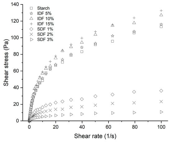 Figure 5 displays the shear stress curves for the gelatinized wheat starch and starch/DF mixtures, while Table 2 presents the fitted parameters of the power law model. The R2 values were all greater than 0.989, suggesting a high model fitting degree for the shear stress and shear rate data.