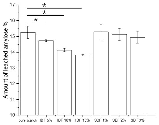Leached amylose of wheat starch and starch/DF mixtures under diverse DF concentrations. Data are presented as mean ± standard deviation, * p < 0.05.