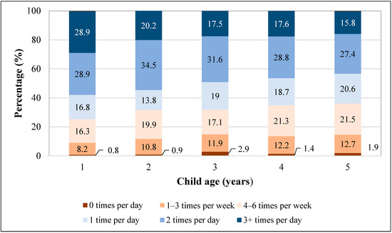 Daily vegetable intake was less prevalent than daily fruit intake, overall and across exposures (Table 1). The percentage consuming daily vegetables was higher among those aged 1 year (56%) than among those aged 5 years (47%), and a larger percentage of children aged 5 years consumed no vegetables in the last week (8.3%), compared to those aged 1 year (2.8%) (Figure 2). Daily vegetable intake was significantly different across all child, caregiver, and household characteristics, except for child sex, number of children in the household, and MSA status (Table 1). After adjustment, factors significantly associated with daily vegetable intake included child age, child race and ethnicity, childcare from someone other than the parent or guardian, and the frequency of family meals (Table 2). Children who were older (5 years vs. 1 year), Black or Hispanic (vs. White), received <10 h per week of childcare from someone other than the parent or guardian (vs. ≥10 h), or from households eating less frequent family meals per week (4–6 days/week or 0–3 days/week vs. every day) had significantly decreased odds of consuming daily vegetables. For example, children who were Black or Hispanic were less likely to consume daily vegetables than children who were White (aOR 0.51; 95% CI 0.38, 0.67; aOR: 0.70; 95% CI 0.57, 0.87, respectively).