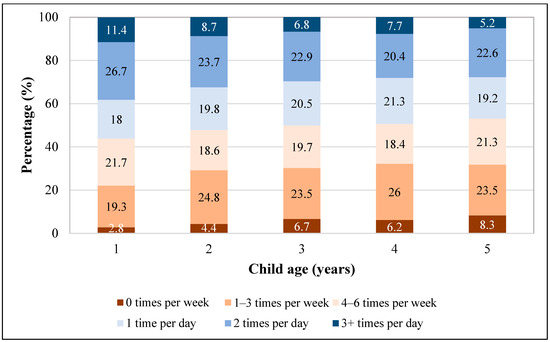 This analysis included 18,418 children aged 1–5 years. The age and sex distributions were approximately equal, with 20% and 50% of children in each age and sex group, respectively. Approximately 5% of children were Asian (n = 1052), 7% were multiracial or another race (n = 1568), 13% were Black (n = 1066), 25% were Hispanic (n = 2415), and 50% were non-Hispanic White (n = 12,317). Overall, 68% (n = 11,124) and 51% (n = 8292) consumed fruit or vegetables daily, respectively.