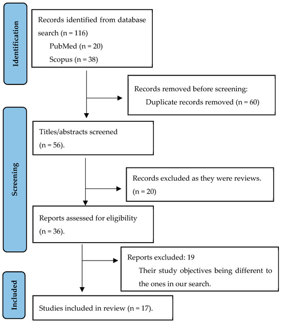 After the literature search, 116 articles were identified. After excluding 99 of them, 17 articles that met the inclusion criteria were retained and included in the final review. The screening process can be seen in Figure 1, in a flow diagram of the search process, adapted from PRISMA.