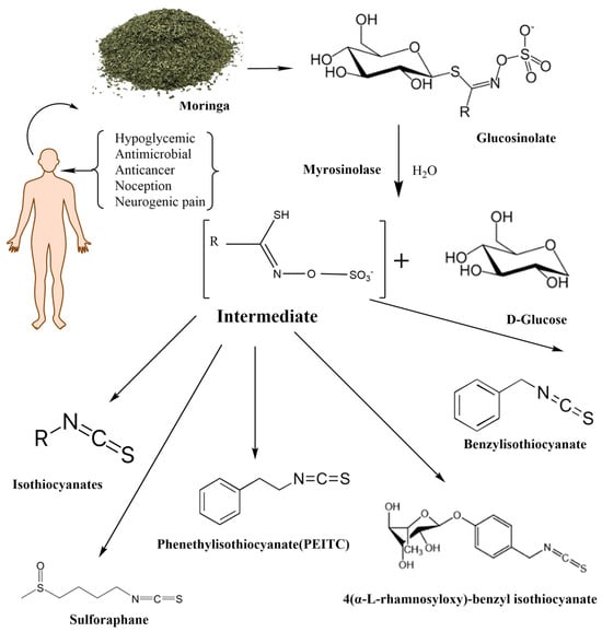 Isothiocyanates, a class of compounds predominantly found in cruciferous plants such as broccoli, cauliflower, kale, cabbage, watercress, and others, impart these vegetables with their characteristic spicy and bitter taste. Epidemiological studies dating back to the early 1990s have indicated that an increased intake of these vegetables can yield beneficial health effects and has the potential to mitigate the risk of developing certain diseases. These hypotheses were subsequently corroborated by clinical studies [,]. Isothiocyanates emerge as biologically active products resulting from the hydrolysis of glucosinolates, secondary metabolites found in plants from the Brassicaceae family. The conversion of glucosinolates into bioactive forms occurs through the process of hydrolysis, catalyzed either by the endogenous enzyme myrosinase (β-thioglucosidase) or human gastrointestinal microbiota [,,]. The activation of glucosinolates into their active metabolites takes place when plants are exposed to various stressors such as infections or mechanical damage. Consequently, the formation of isothiocyanates serves as a defensive mechanism protecting the plant from injury [,]. This intriguing observation prompted further investigations into isothiocyanates, aiming to unravel the underlying mechanisms facilitating plant survival in diverse conditions. Studies have revealed that isothiocyanates encompass a plethora of health benefits, including antidiabetic, anticancer, analgesic, and cardioprotective effects, the potential to treat neurological disorders, and regulation of thyroid gland function [,,]. Thus, the purpose of this review is to consolidate current understanding about well-studied isothiocyanates such as sulforaphane and phenyl ethyl isothiocyanate, and to compare them with less investigated moringa isothiocyanates (MIC). The focus is directed toward elucidating differences and similarities in the anticancer, anti-inflammatory, and antioxidative efficacy of these compounds.