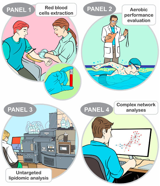 Experimental design of the study. Red blood cells (RBC) were collected by centrifugation of venous blood samples (Panel 1). The RBCs were preserved at −80 °C until further use. Subsequently, the swimmers underwent four predictive trials at 100, 200, 400, and 800 m to determine the critical velocity (Panel 2). Panel 3 shows that untargeted lipidomics were performed using an ultra-high-performance liquid chromatography system coupled to a quadrupole time-of-flight mass spectrometer. In Panel 4, the complex network and eigenvector centrality identified the lipids that were most relevant for the critical velocity, which was the target of this analysis.