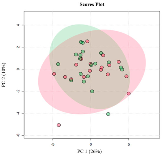 The principal component analysis (PCA) between male and female adolescent swimmers regarding the lipids identified in lipidomic analysis that were relevant for aerobic performance; red—female; green—male.