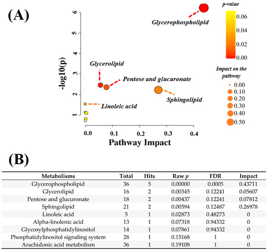 The enrichment pathway analysis was performed with all metabolites (n = 119), which indicated intermediary lipids in the glycerophospholipid, glycerolipid, sphingolipid, linoleic acid, and alpha-linolenic metabolisms, as well as pentose and glucuronate interconversions (Figure 3). A significant impact of the intermediary lipids was observed for the glycerophospholipid metabolism, including phosphatidylethanolamines (PEs), phosphatidylcholines (PCs), 1-acyl-sn-glycero-3-phosphocholine, sn-glycerol 3-phosphate, and phosphatidic acids. While the latter two classes of lipids also have intermediate glycerolipid metabolisms, sphingomyelin (SM) and ceramides (CERs) were found to be hits of the sphingolipid metabolism. In addition to glycerophospholipid metabolism, PC also has intermediate linoleic acid metabolism, which was highlighted in this pathway. Lastly, D-xylose and D-xylonolactone were the hits in pentose and glucuronate interconversions. The entire glycerophospholipid metabolism is presented in Supplementary Figure S2.