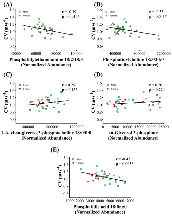 The lipids highlighted in the glycerophospholipid metabolism pathway were correlated with the CV (Figure 4). Inverse and significant associations were observed for PE 18:2/18:3 (Figure 4A), PC 18:3/20:0 (Figure 4B), and phosphatidic acid 18:0/0:0 (Figure 4E) with the CV.