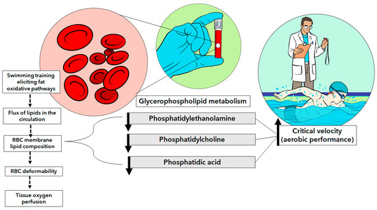 There is a growing body of evidence that supports the idea that phosphatidylethanolamines can be modified by glycation, oxidation, and other chemical processes [41,42,43,44,45]. With this in mind, it is reasonable to expect harmful changes in membrane thickness and rigidity, and thus RBC locomotion could be seriously compromised [46,47]. This agrees with previous findings confirming that acute exercise decreases RBC deformability [48,49,50,51]. In contrast to acute exercise-related alterations in RBCs, exercise training is known to improve hemorheological parameters [50]. Although we have no measurements of hemorheological parameters (e.g., whole-blood viscosity, RBC aggregation, RBC deformability), we believe that endurance-trained swimmers have enhanced blood flow capacity (likely facilitating oxygen diffusion and tissue repair during rest moments). This, in turn, could be achieved with highly deformable RBCs, which would have conditions to pass (due to reduced membrane stiffness) through the smallest capillaries. All these findings are intriguing and emphasize that the RBC has a complex role, which further depends on the condition in which these cells were harvested, such as exercise or rest (which was our case). Future in-depth studies will need to be conducted to understand mechanisms involving aerobic capacity and RBC glycerophospholipids, comparing both rest and exercise conditions from an integrated perspective. Some of the main findings are sketched in Figure 5.