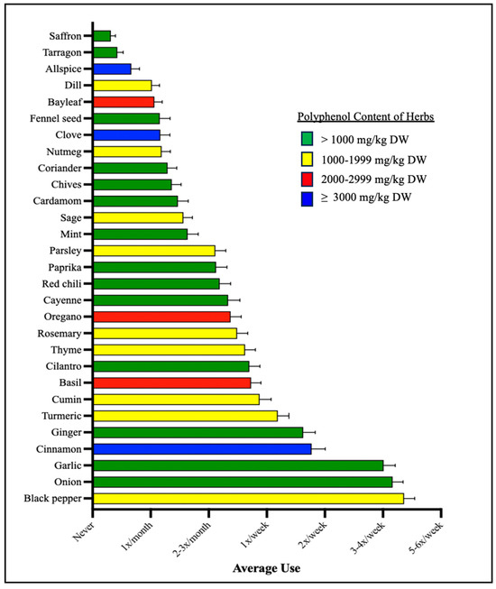 Average herb and spice use. Shown here are the average frequencies with which each herb and spice was used by study participants. Each herb and spice are color labeled by the category of its total polyphenol contents in milligrams (mg) of total polyphenols per kilogram (kg) dry weight of the herb/spice (mg/kg DW).