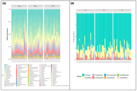 Relative genus (Figure 2A) and phylum-level (Figure 2B) abundance for each participant is described and stratified by exposure categories. All groups were characterized by the Firmicutes being the dominant phyla, followed by Bacteroidota, Actinobacteria, and Proteobacteria with no significant differences between groups. There also appear to be two outliers in the high group with respect to Proteobacteria abundance.