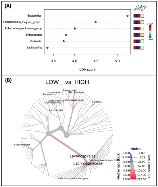When examining differences in taxa abundance at the genus level between low, medium, and high consumers of dietary polyphenols (Figure 4A), the abundance of Lactobacillus (p-value = 0.007) and Sutterella (p-value = 0.064) was highest in the high-consumer group and lowest in the low-consumer group. Conversely, the abundance of Eubacterium ventriosum group (p-value = 0.014), Ruminococcus torques group (p-value = 0.038), Bacteroides (p-value = 0.052), and Enterococcus (p-value = 0.057) in the low-consumer group and lowest in the high-consumer group (Figure 4A). A phylogenetic heat tree comparing abundances between the low versus high consumer groups, including differential abundances analyzed by Wilcoxon Rank Sum, are also represented (Figure 4B).