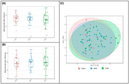 Alpha (Figure 3A,B) and beta diversity (Figure 3C) measures were described for participants and stratified by exposure categories. The Shannon Index values, a measure of alpha diversity, did not differ between low (M = 3.88, SD = 0.15), medium (M = 3.82, SD = 0.19), and high (M = 3.79, SD = 0.28) consumers of dietary polyphenols in this sample (Figure 3A). Observed richness, another measure of alpha diversity, also did not differ between low (M = 121.41, SD = 17.54), medium (M = 113.29, SD = 20.09), and high (M = 121.56, SD = 26.56) consumers of dietary polyphenols in this sample (Figure 3B). Bray–Curtis dissimilarity distances were plotted using Principal Coordinate Analysis (PCoA) plotted Bray–Curtis dissimilarity metrics of low, medium, and high consumers of dietary polyphenols (Figure 3C); PERMANOVA using these metrics revealed no differences in the beta diversity of microbial communities between these groups.