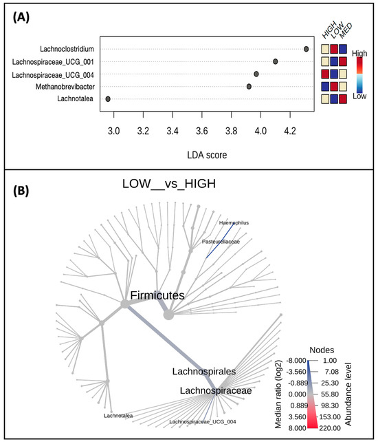 When exploring differences in taxa abundance at the genus level between low-, medium-, and high-frequency users of polyphenol-weighted herbs and spices (Figure 6A), Lachnospiraceae UCG 004 (p-value = 0.006), Lachnotalea (p-value = 0.037), and Lachnospiraceae UCG 001 (p-value = 0.085) had the lowest abundance in the low-frequency group. While Lachnospiraceae UCG 004 had the highest abundance in the high-frequency group, both Lachnotalea and Lachnospiraceae UCG 001 had the highest abundance in the medium-frequency group. Conversely, the abundance of Lachnoclostridium (p-value = 0.025) and Methanobrevibacter (p-value = 0.092) were highest in the low-frequency group; the abundance of these genera decreased as the frequency of use increased. A phylogenetic heat tree comparing abundances between the low- and high-frequency users, whose differential abundances were analyzed by Wilcoxon Rank Sum, is also represented (Figure 6B).