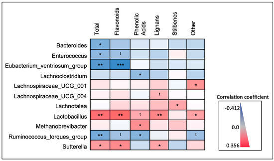 Spearman’s rank correlations between taxa abundance and estimated daily consumption of major polyphenol classes. Microbial taxa identified as biomarkers of polyphenol exposure were further explored by correlating the relative abundance of each with estimated daily polyphenol consumption (“Total”; mg/day), and the five major polyphenol classes. Shown is a heat map displaying the directionality (e.g., positive or inverse) and significance of the correlation coefficients. * p < 0.05; ** p < 0.01; *** p < 0.001; t < 0.1.