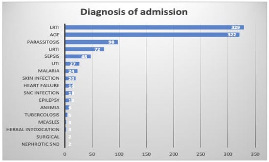 The available clinical records of all the under-five children admitted to the Port Sudan Emergency Pediatric Hospital from 1 February 2021 to 31 January 2022 were analyzed. Emergency is an Italian nongovernmental organization that offers qualified medical assistance with guaranteed collection of reliable data []. The demographic and social environmental characteristics of the enrolled children were recorded, including previous medical history, age, body weight, height, reason for hospitalization with detailed presenting symptoms, radiological and laboratory findings, and final diagnosis. Regarding the evaluation of nutritional status, the presence of wasting and kwashiorkor was assessed according to methods previously described by the WHO []. In particular, wasting was considered moderate or severe if weight-for-height z scores (WAZ) were below −2 or −3 standard deviations of the WHO Child Growth Standards median, respectively. Alternatively, the mid upper arm circumference (MUAC) was used and MUAC between 11.5 cm and 12.4 cm and <11.5 cm was deemed as an expression of moderate or severe wasting, respectively. Kwashiorkor was diagnosed in the presence of edema that was graded as mild, moderate, or severe if it affected only the feet, or the feet, legs, and upper limb, or it was generalized. In the final evaluation, cases with wasting or kwashiorkor were considered together and identified according to the degree of undernutrition as moderate acute undernutrition (MAU) or severe acute undernutrition (SAU, i.e., marasmus).