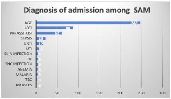 In Figure 2, the causes of hospitalization in children with SAU are reported. As shown, wasting or kwashiorkor were observed mainly in children with AGE (n = 249; 50.3%) or LRTI (n = 88; 17.8%). Parasitosis was diagnosed in 12.6% of children with SAU, sepsis in 4.7%, URTI in 3.4%, and skin infection in 1.2%.