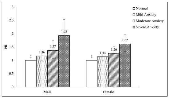 Figure 1 illustrates the results of the association between high-caffeine drink consumption and various levels of anxiety. The PRs increased as the anxiety level became higher for both male (adjusted PR: 1.16, 95% CI: 1.01–1.35 for mild anxiety; adjusted PR: 1.37, 95% CI: 1.07–1.75, for moderate anxiety; adjusted PR: 1.93, 95% CI: 1.47–2.53 for severe anxiety) and female participants (adjusted PR: 1.14, 95% CI: 0.98–1.31 for mild anxiety; adjusted PR: 1.26, 95% CI: 1.04–1.53 for moderate anxiety; adjusted PR: 1.62, 95% CI: 1.34–1.96 for severe anxiety).
